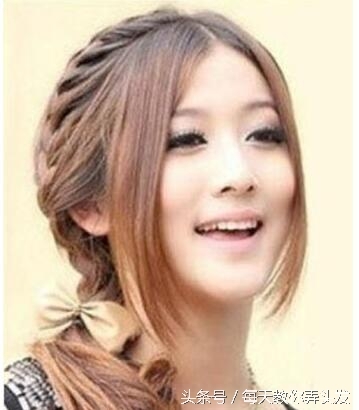这款淡雅悠闲的亚麻色柔顺发丝简单的编发后拢放在肩的一侧扎成马尾,搭配上一款清新的发饰将青春少女的甜美气质完美的呈现了出来,中分的刘海沿脸部线条垂落凸显出一张精巧的脸,散发出温婉恬静的淑女气质。