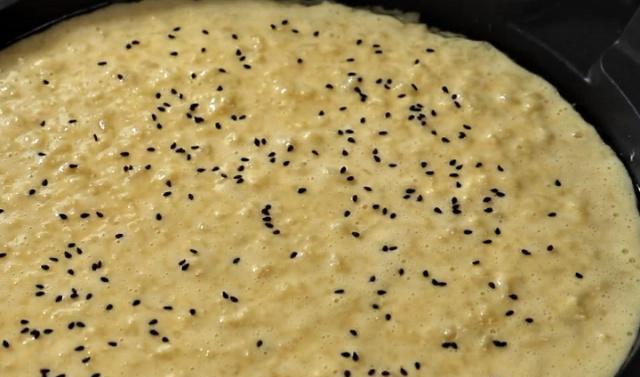 山药饼第三步:在电饼铛里刷上油,把面糊倒进去,用铲子摊平了,撒上一层黑芝麻,盖上盖子焖3分钟,时间到翻面再焖3分钟,再一次时间到出锅切成块就可以食用了。