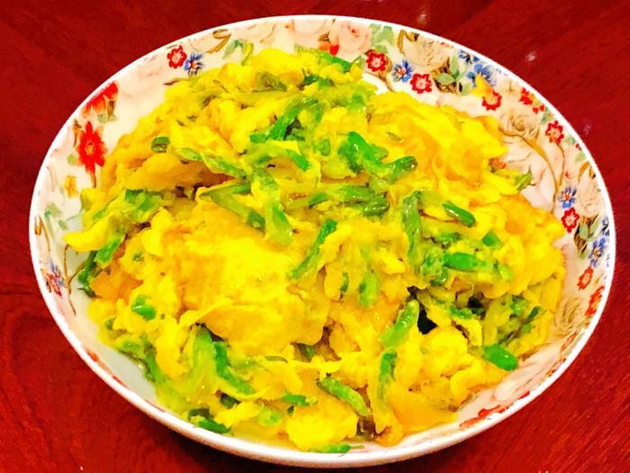 外婆就会拿一个篮子去采摘它的花朵下来,一朵一朵的采摘,然后洗干净用来炒鸡蛋吃,不过因为它上面有木质刺,所以采摘的时候要小心一点,不要让木质刺刺到手了。