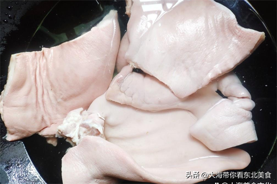 猪头肉清理洗干净,凉水下锅,加姜片焯水。