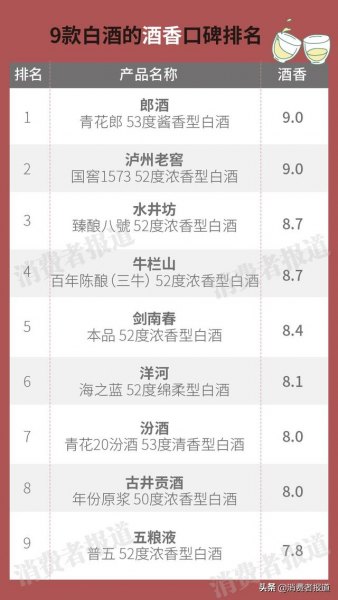 2025年3月,《消费者报道》分析了天猫、京东、苏宁旗舰店上约1.3万条消费者使用评价,对泸州老窖、五粮液、汾酒、剑南春、洋河、郎酒、水井坊、古井贡酒、牛栏山等9款知名白酒进行了口碑评价,评价指标分为味道、口感、酒香、柔和度、酒质等。