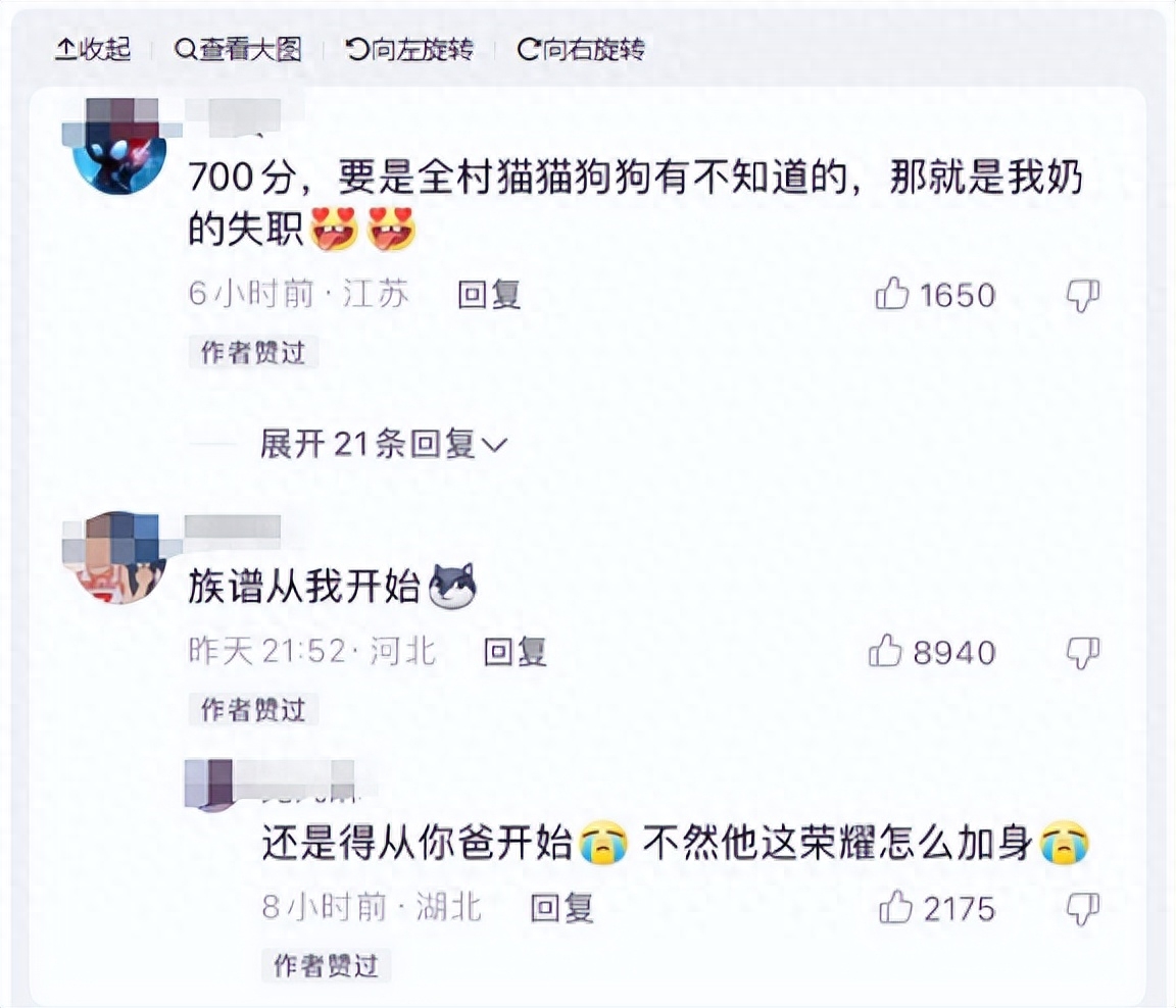 考上700分不仅关乎到自己,还关系到自己的父母和爷爷奶奶。网友们说如果我考上了700分,全村猫猫狗狗要是有不知道的,那就是我奶奶的失职。我们也真不明白,到底怎么证明猫猫狗狗知道了你考上700分的事情?