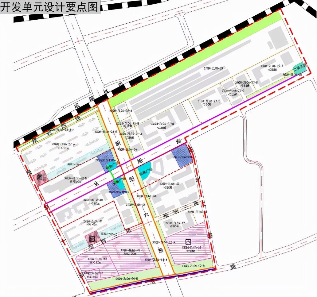 单元沿金旭路和朝阳六路集聚综合服务与产业办公,外围布局生活配套功能。单元在朝阳六路西侧沿滨渭路和金旭路建设星级酒店和商业中心,沿规划一路布局3个商品住宅小区,沿规划二路建设1所42班小学。