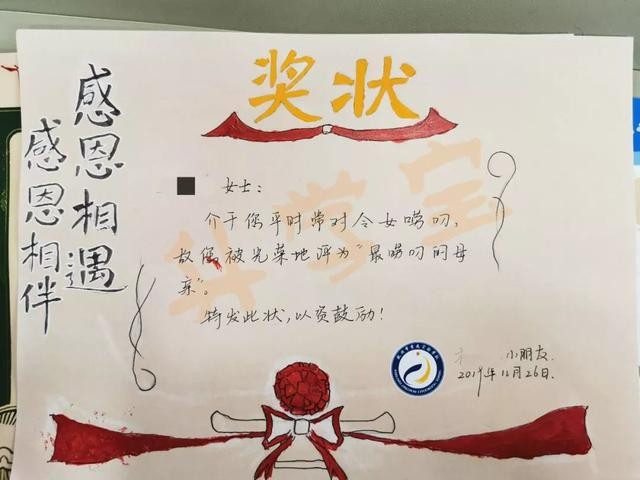前段时间,期中考试结束,杭州景成实验学校召开家长会,让家长意想不到的是,每个家长都收到了一张奖状,这让不少家长感到意外和惊喜。原来,这是家长会的一个环节——“我给家长发奖状”,老师让孩子们根据父母平时的个人表现,想出一个有意思的奖状名称,还要写清获奖理由。