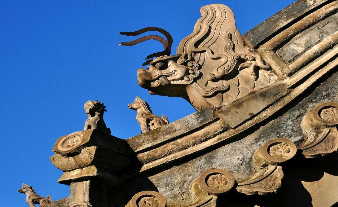 螭吻又称鸱吻或鸱尾,是龙的九个儿子中的最后一个。螭吻具有宽阔的嘴巴和喜欢吞食的特点。他的形象经常被刻在殿脊两端,形成了卷尾龙头的装饰。螭吻的外形类似于去掉尾巴的四脚蛇,他喜欢在险要之处东张西望,并对火焰有着特殊的兴趣。