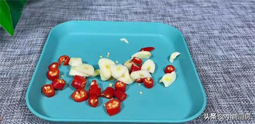 然后再来切点小料,准备2个蒜子切成蒜、2个小米辣切成辣椒圈用小米辣炒菜,比用干辣椒炒出来的味道更好,不喜欢吃辣的也可以不放,全部切好后摆到盘里备用。