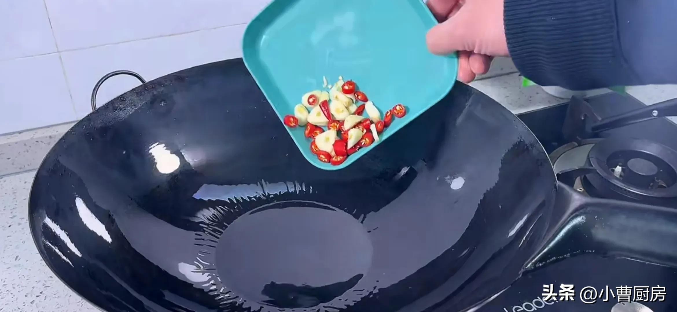 接下来起锅烧油,往锅里加入少许食用油,将油烧热后把小米辣和蒜片倒进锅里,用我的右手给它煸炒出香味儿。