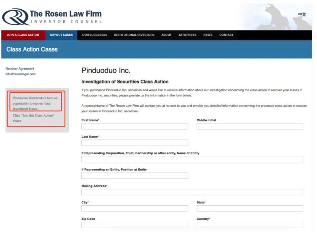 《商学院》记者注意到,各家律所都在其声明中附有表格链接,邀请购买了拼多多股票的投资者们加入集体诉讼。股民只要打开网页,简单填写个人信息和联系方式,就能作为原告之一参与到对拼多多的诉讼当中。