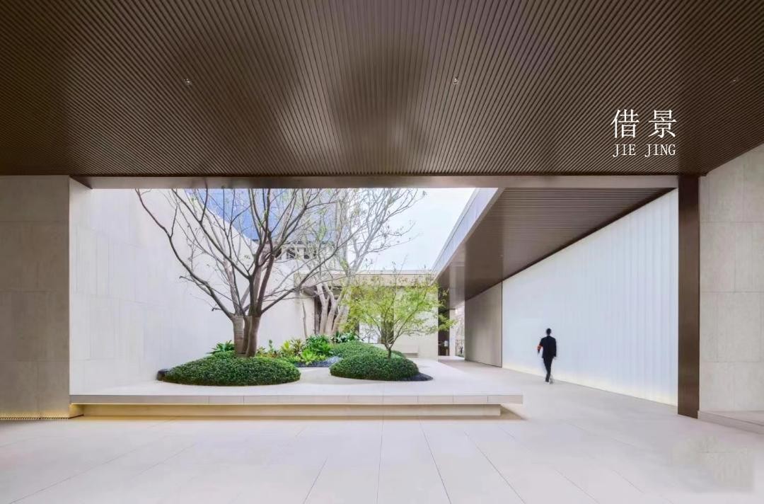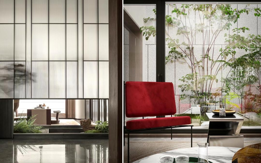 借景设计手法是指有意识的把空间外的景物借到内部视线范围中,可延伸空间的深度和广度,感觉上显示出了虚实相生的空间情趣。