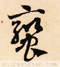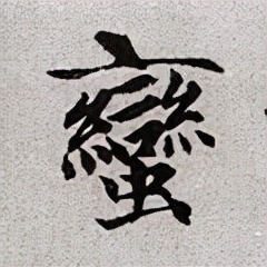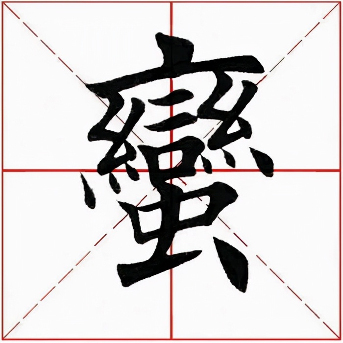 下部“虫”字旁紧凑上靠,上收下展,不要写高。“口”扁宽,上宽下窄:左竖稍抖起笔,注意位置,向下稍右斜,勿重、勿长;横折虚接起笔,横画勿重,抗肩,到位后往上稍提笔锋、稍重顿笔写竖,内擫,左斜,渐轻,勿长;底横实接起笔,抗肩,收笔实接右竖。竖提虚接起笔,竖身左斜,弯行,上重下轻带撇意,过“口”后勿长,向左稍带、切笔写提,注意角度;末点稍重、稍长,以稳住整字。