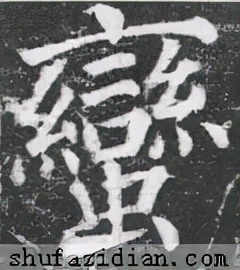 上部紧凑抗肩,不要写高。“言”字首笔竖点居中,稍重,稍左斜,勿长;横画起笔左探,抗肩,略呈俯视,压首点下部而过,不要写重;中间两横稍偏左,抗肩,勿长,注意轻重变化;下面“口”字形扁宽,勿大,注意重心两横直对。左右两个“糹”左低右高,左小右大,注意形态、角度的变化,以及与“言”字的笔画的穿插避让。