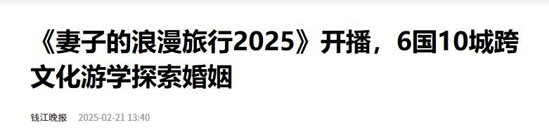 钱江晚报:《妻子的浪漫旅行2025》开播,6国10城跨文化游学探索婚姻