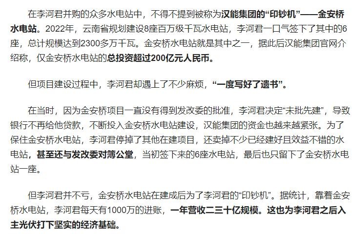 李河君的成功在于他能够在短时间内抓住行业的机会,并迅速扩张,尤其是在水电和太阳能行业的双重布局。