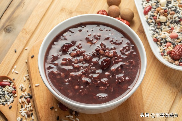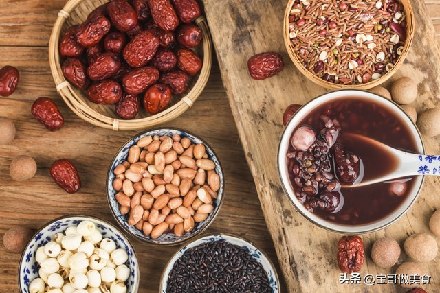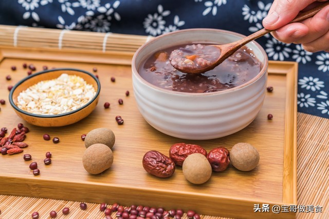 主料:糯米50g、黄米20g、黑米20g、麦仁20g、薏仁20g、小红豆20g、绿豆20g、花生米20g、莲子20g、桂圆10粒。辅料:冰糖20g、红枣6个。