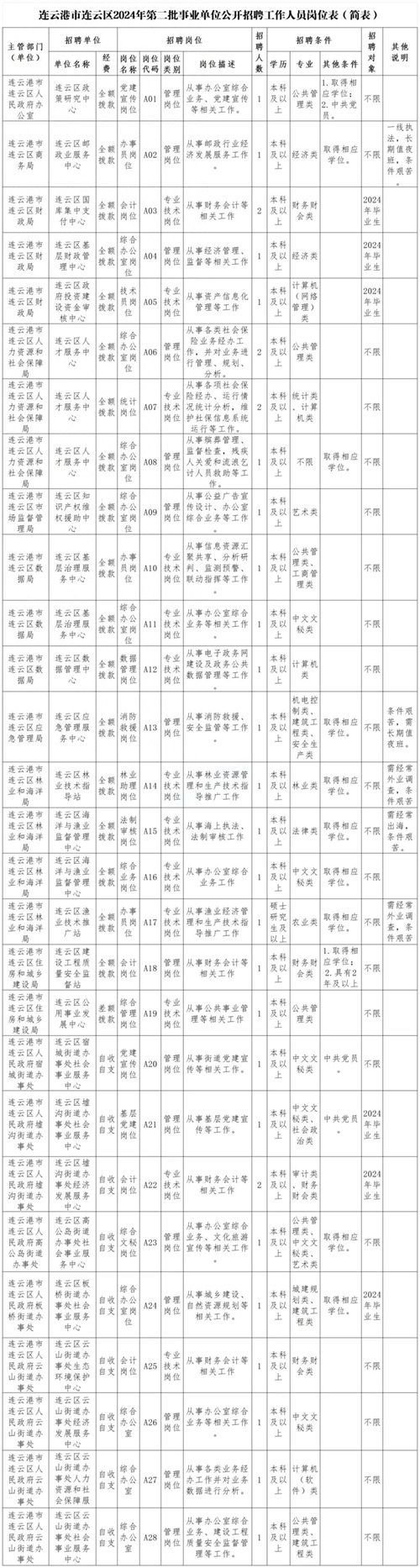 一、招聘岗位具体岗位及各岗位招聘条件等详见《连云港市连云区2024年第二批事业单位公开招聘工作人员岗位表》(附件1,以下简称《岗位表》), 《岗位表》可在连云区人民政府网(http://www.lianyun.gov.cn)查询、下载。