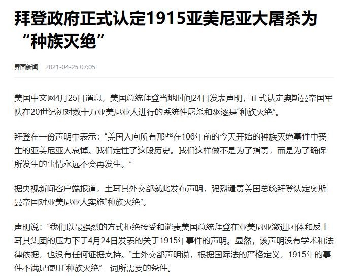 拜登政府正式认定1915亚美尼亚大屠杀为“种族灭绝”,界面新闻,2021-04-25