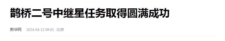2024年4月12日,我国宣布鹊桥二号任务取得成功,诚邀各国合作,鹊桥二号会为大家提供通信服务。
