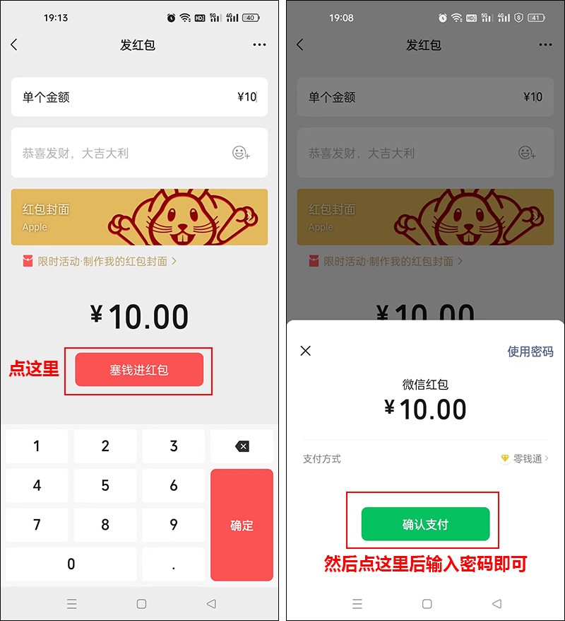 输入好金额后,点【塞钱进红包】那几个字,选择【确认支付】,然后输入密码,红包就会直接发给好友了。