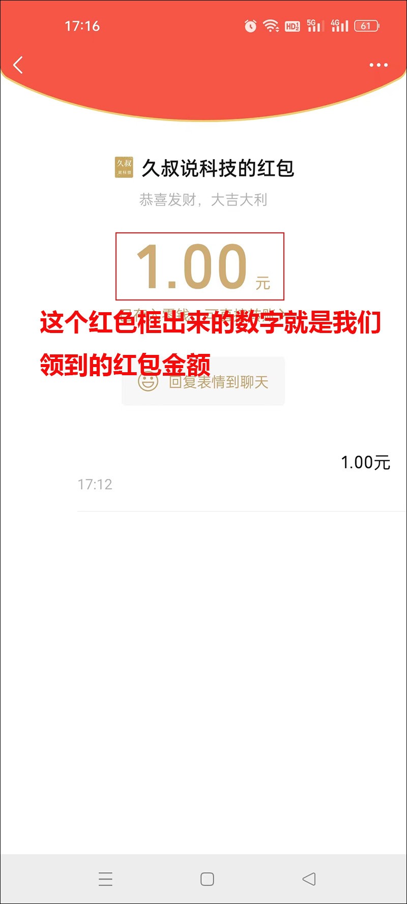 领到红包后,怎么看我们领到了多少钱呢?如果是微信好友单独发给我们的,在领到的界面中间那个大大的数字,就是我们领到的金额,像下图这样,说明我们领到的红包金额是1元。