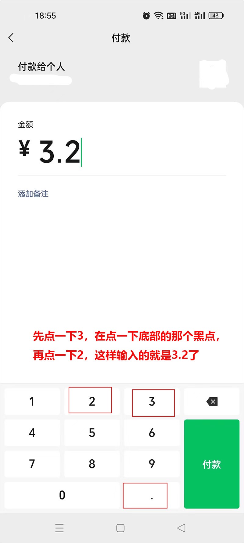 点了【扫一扫】后,我们用手机对准老板给的码,一定要先跟老板确认那是不是他的码,你要扫来付菜钱,不要随意看到码就扫,以免错给了别人。对着老板的码扫一下后,就进入到输入金额的界面了,菜一共是多少钱,我们就输入多少钱,比如我们买了三块二的青菜,那么金额我们就输入3.2就可以了,就是下图中圈出的三个位置,输入完毕后,就可以看到金额栏目那的数字为3.2,然后我们点一下右下角的【付款】,再输入我们的支付密码就可以了。支付密码不会设置的,可以让自己的孩子或者其他年轻的亲人帮忙设置一下,不要找陌生人帮忙设置,以免自己的钱被转走了都不知道。
