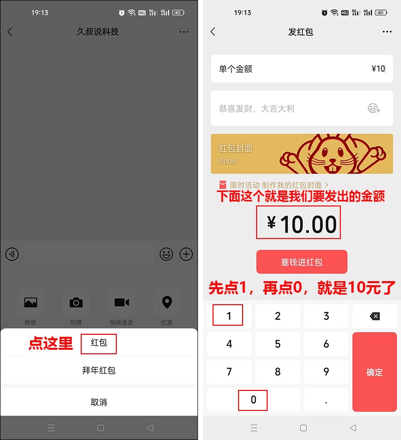 因为现在还是春节期间,所以还有一个拜年红包选项,我们可以忽略拜年红包这个选项,直接选【红包】,然后输入你想发的金额,比如想发10块,就点一下【1】和【0】这两个数字,就好了。