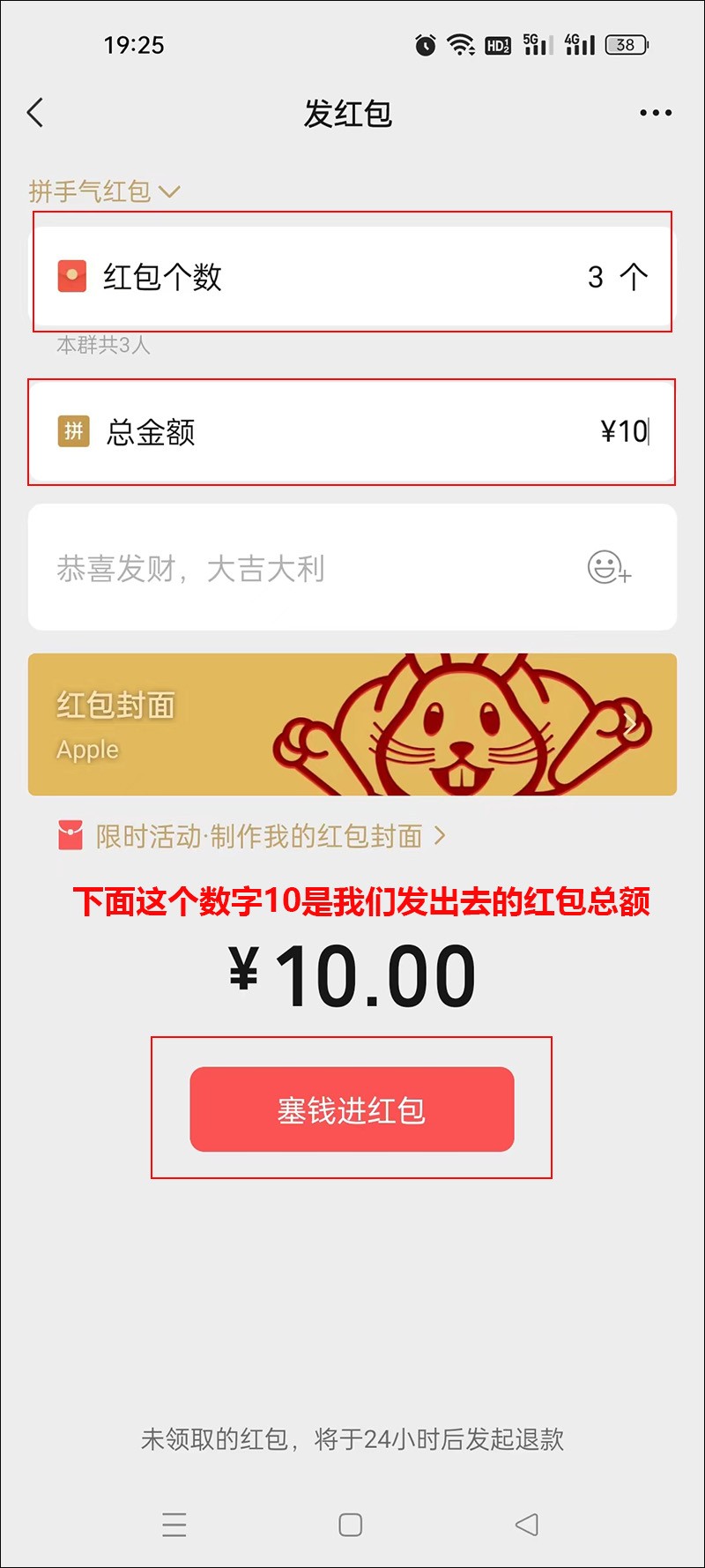 这个时候我们同样进入了输入红包金额界面,但是这里有点不同,需要填写红包个数和总金额,比如群里有三个人,我们想发3个红包,一共发10块钱,在红包个数那,我们就输入3,在总金额那就输入10就好了。然后同样点【塞钱进红包】,输入支付密码,红包就成功发到群里了。