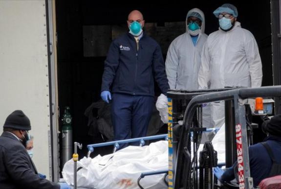 新冠疫情期间,美国纽约市大量人口集中死亡,造成停尸房告急,不得不采取冷藏车保存尸体,每辆车内临时拼装三层木板,然后摆满尸体,最多装下了100多具尸体。