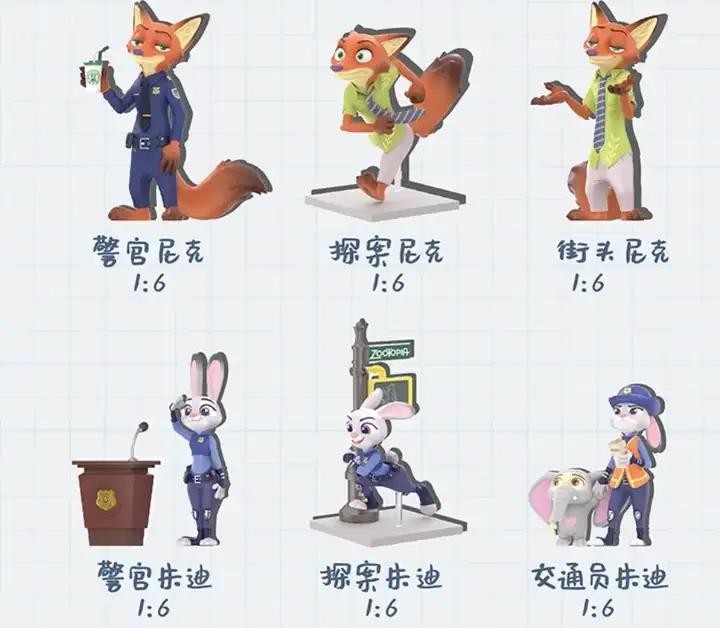 这个是迪士尼电影《疯狂动物城》里的尼克和朱迪的盲盒,这两个还是很好嗑的,所以才专门有套他们的系列。每个盲盒是单一的朱迪或者尼克,都是比较经典的造型。