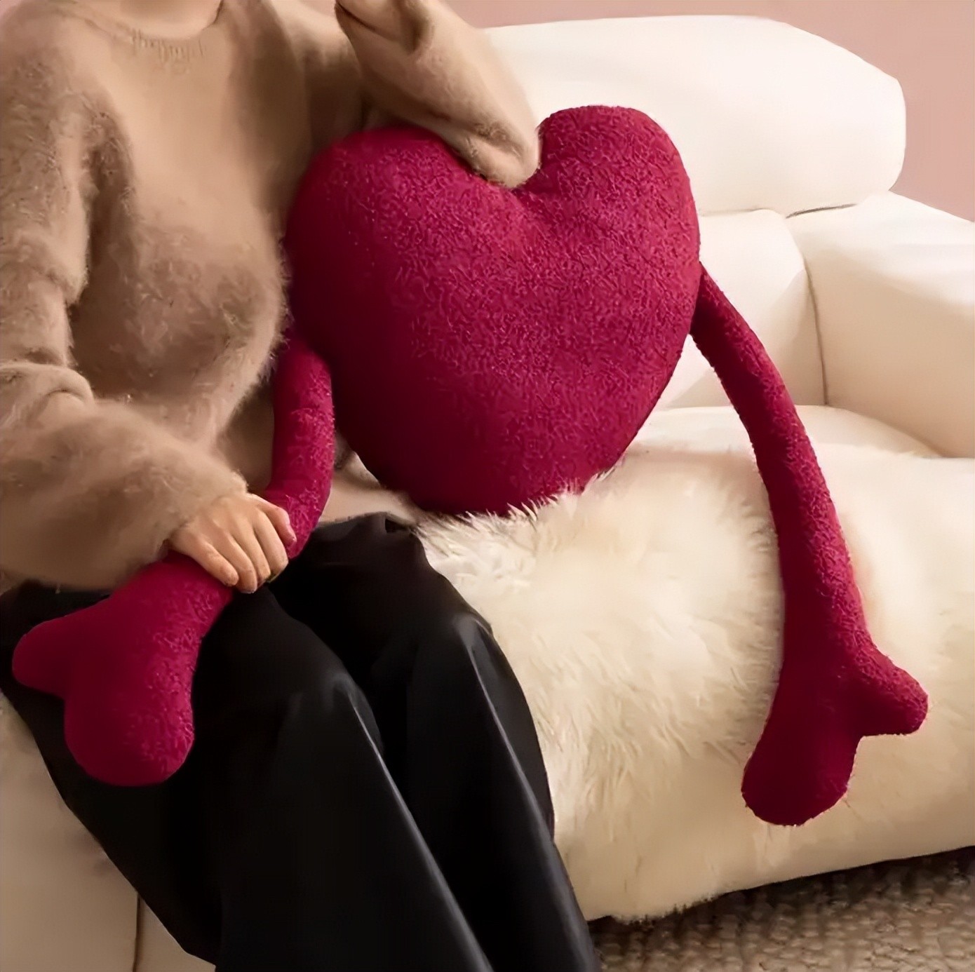 材质是泰迪绒,摸起来很舒服,放在椅子上沙发上也是随时随地就有爱的抱抱。颜色不是正红,是很好看的紫调红呢~