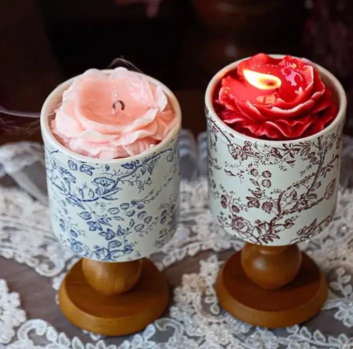 香薰蜡烛带来的香气跟浪漫也是很贴合,这个是木脚杯里放了山茶花造型的香薰蜡烛,有粉色山茶花和红色山茶花,分别是茉莉山茶味和丝绒玫瑰乌木味。