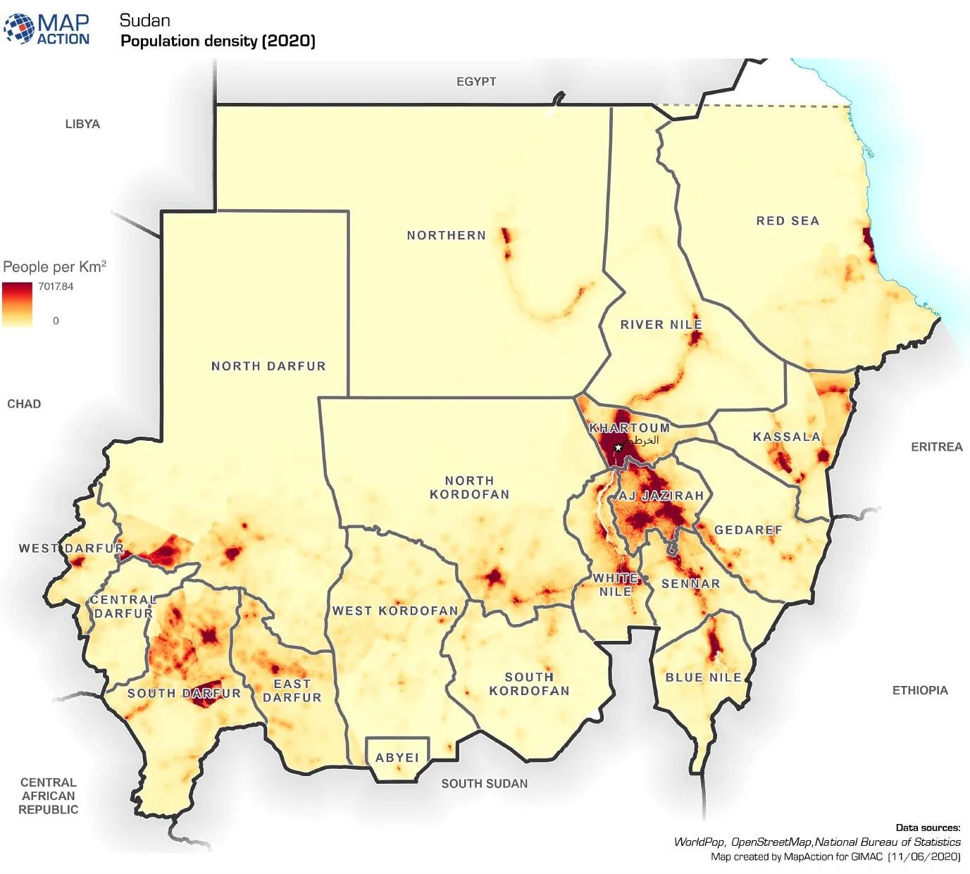 苏丹人口超过4600万,是非洲人口第九大的国家。从下图,我们可以看到大部分苏丹人口集中在几个关键区域,而国家的大部分区域是人口稀疏。