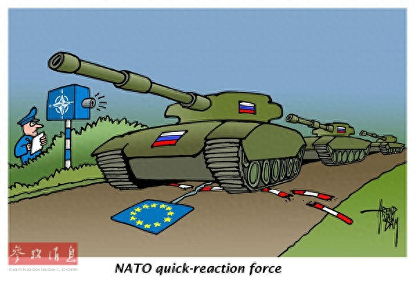 当北约人员拿着纸和笔在边境监测时,俄罗斯坦克部队已经大兵压境,并将欧盟边界栏杆碾于车轮之下。2日,28个北约国家的外长在布鲁塞尔开会,打算对俄罗斯可能的威胁采取防御措施,重点是建立一支超级快速反应部队。(原载美国政治漫画网)