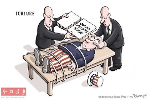 山姆大叔(美国的象征)被绑在桌子上,被迫睁开眼睛阅读《中情局审讯技巧报告》。美国参议院情报委员会9日公布报告,首次官方讲述中央情报局特工对涉恐嫌疑人的刑讯逼供情况,包括禁止睡觉、囚禁在狭小空间、实施人身羞辱,以及动用水刑等。(原载美国报刊漫画家协会网站)