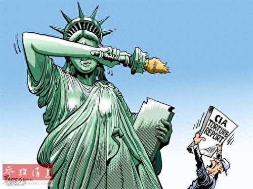 面对《中情局酷刑报告》,自由女神用手臂挡住眼睛,不愿意看到报告的内容。(原载阿联酋《海湾时报》网站)