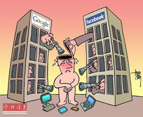 网络巨头“谷歌”和“脸书”的强势地位让广大网民的隐私无所遁形。(原载美国政治漫画网)