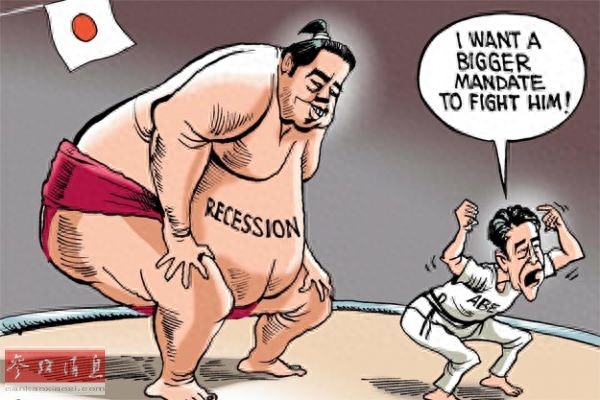 面对“经济衰退”这个相扑比赛中的庞然大物,渺小的对手安倍叫喊道:“我要更大的授权去对付它!”(原载阿联酋《海湾时报》网站)