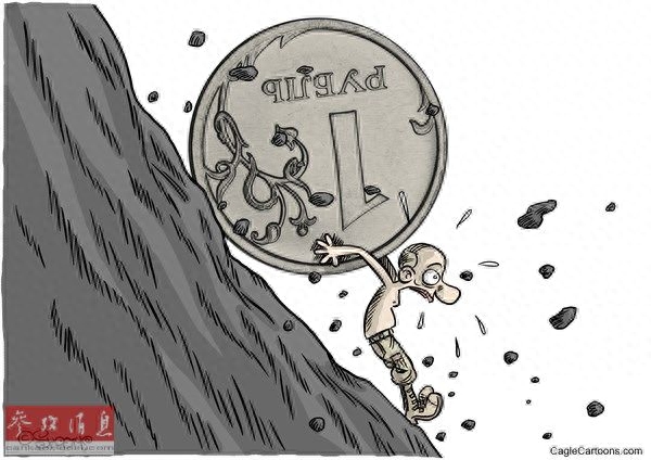 俄罗斯总统普京奋力顶住正在往下滚动的“卢布”硬币。自年初以来,卢布汇率已总计下跌近60%,成为今年全球表现最差的货币。(原载美国政治漫画网)