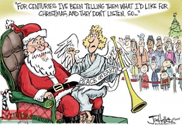 天使对圣诞老人说:“几个世纪以来我都在告诉他们(地球人),我圣诞节希望得到什么,可是他们不听我的。所以……”天使手中号角的丝带上写着“地球和平”。(原载美国政治漫画网)