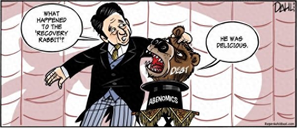 日本首相安倍晋三用“安倍经济学”魔术帽子变出的不是“复苏兔子”,而是“债务熊”。安倍问:“‘复苏兔子’发生什么事了?”“债务熊”回答:“它很好吃。”(原载《日本时报》网站)