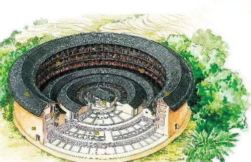 圆楼:又称圆寨,在圆形建筑物中,三堂屋已经隐藏,尊卑主次严重削弱;寨是堡垒,防御功能上升到首位,俨然成为极有效的准军事工程。