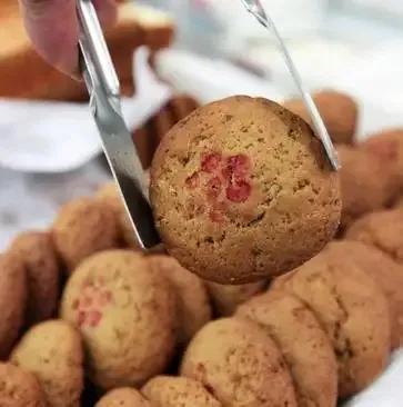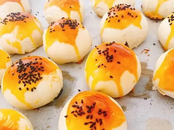 蛋黄酥,蛋黄酥工料考究,造型完整,图案清晰,质地细腻,制作时先把糖粉、蛋黄、食油、精粉混合加水制作而成。