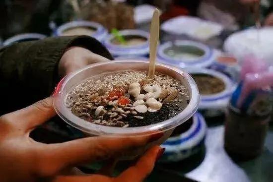 杏仁茶是开封的著名小吃,大大小小的夜市里都有它。开封的杏仁茶实际上是藕粉沏的,杏仁只是其中一味小料。藕粉在沸水的冲击下变得透明黏稠,配上红糖腌制的玫瑰酱、葡萄干、芝麻、花生碎、青红丝、湿杏仁等。白芝麻,核桃仁,花生碎,瓜子仁都是经过炒制而成的。