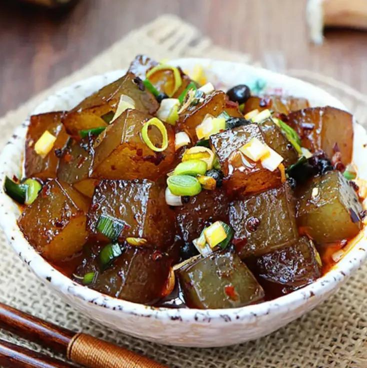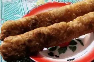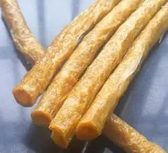 豆腐棍由黄豆浆炒制而成,其形如棍,中空、皮薄,色自惭形微黄而透明,第约30公分。每捆十根,重一两三钱左右,味道鲜美,富有营养,凉拌清爽可口,馅浓郁喷香。