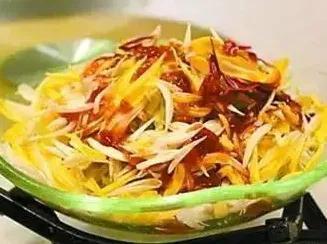 菊甜三丝是将砀山梨、黄瓜、白萝卜、菊花瓣四种原料加入橙汁、白糖等撵制而成。特点:色彩清朗,酸甜爽口,菊化清香。