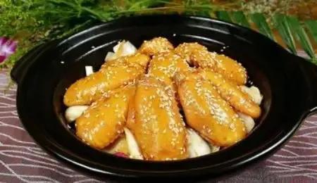 芝麻翅中翅豫菜的用料一般都很家常,妙在调味和火候。芝麻翅中翅其实就是腌鸡翅外裹蛋汁再蘸芝麻,放油中炸。炸熟的蛋汁酷肖蝉翼。