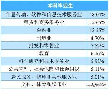 本科毕业生就业行业比例最高的是“信息传输、软件和信息技术服务业”,占比为 18.04%,其次是“租赁和商务服务业”(12.66%)和“金融业”(12.25%)。
