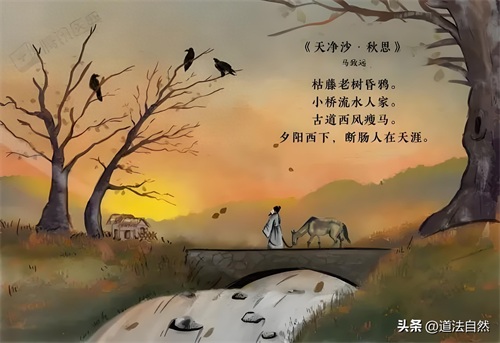 上阕 “枯藤老树昏鸦,小桥流水人家,古道西风瘦马”,以简洁的笔墨勾勒出一幅充满衰败、孤寂的画面。枯藤缠绕老树,乌鸦啼叫,小桥下流水潺潺,几户人家错落其中,古道上西风瑟瑟,瘦马驮着游子前行。这些意象组合在一起,营造出一种凄凉的氛围,虽未直接提及愁绪,却处处透着愁。下阕 “夕阳西下,断肠人在天涯”,夕阳西沉,游子的思乡之情愈发浓烈,“断肠人” 直抒胸臆,将漂泊的痛苦与无奈展现得淋漓尽致。整首曲子将秋景与羁旅愁思完美融合,成为千古绝唱。