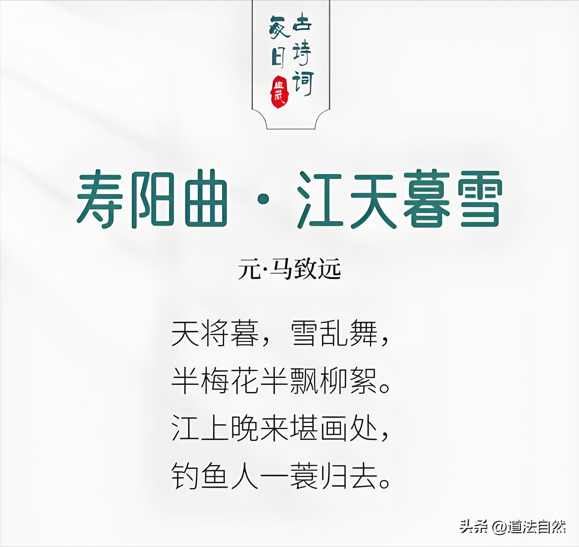 诗词解读与赏析:上阕 “天将暮,雪乱舞,半梅花半飘柳絮”,描绘出冬日傍晚雪花纷飞的景象,将雪花比作梅花和柳絮,赋予雪花别样的美感。下阕 “江上晚来堪画处,钓鱼人一蓑归去”,展现出宁静恬淡的画面,钓鱼人在雪中悠然归去,与江天暮雪的美景融为一体。整首曲子既展现了自然之美,又蕴含着对宁静生活的向往。