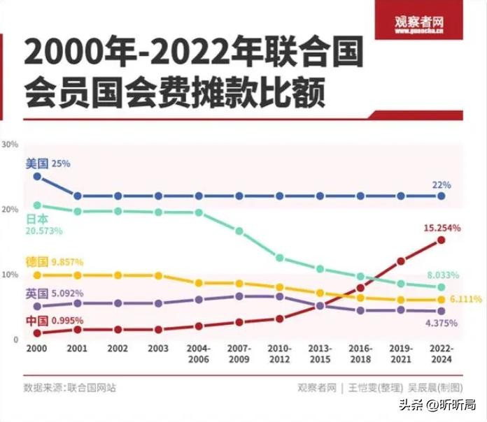 还有中国,我国的会费缴纳比例已经从0.79%上升到了15.254%,这意味着我国成为了第二大会费国。