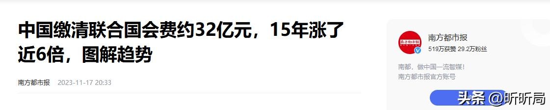 南方都市报:2023年11月17日 中国缴清联合国会费约32亿元,15年涨了近6倍,图解趋势